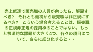 投稿記事 売上低迷で販売職の正社員が余ったら、解雇すべき? それとも最初から販売職は非正規にするべき? 今回は、売上低迷で販売職の正社員が余ったら、解雇すべき? それとも最初から販売職は非正規にするべき? というテーマでお伝えします。 結論から先に言うと、実は、このような2択の検討はまさに見当違いなんです。なぜなら、今、見えているのは氷山... 2025.11.23 投稿記事